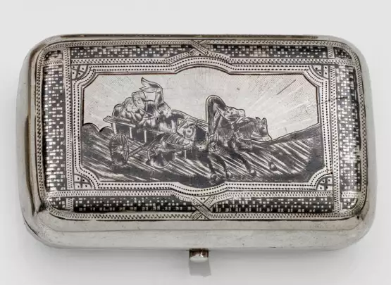 Silber. Rechteckiger Korpus mit gerundeten Ecken und Niello-Dekor in Form von geometrischen Mustern, Blättern und der Darstellung einer Pferdekutsche auf scharniertem Deckel. Innen vergoldet. Gest. 84, Beschauzeichen mit Dat., ungedeutetes Meisterzeichen. Gew. ca. 100 g. H. 2,2 cm. 9,2 cm x 5,8 cm.
