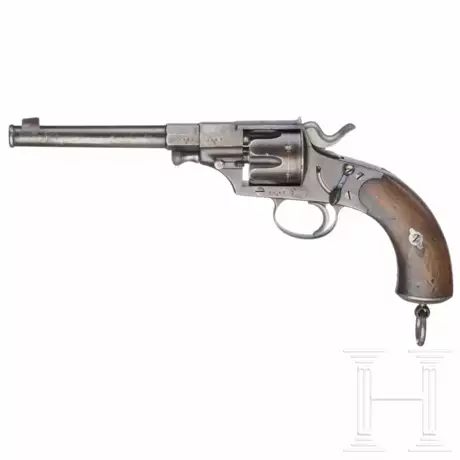 Cal. 10,6mmDtOrd, SN. 1087s, nummerngleich inkl. Schrauben. Fast blanker Lauf. Sechsschüssig. Fertigung "S & S - V.C.S. - C.G.H. - Suhl" (großes Suhler Konsortium). Links an der Laufwurzel Abnahme "GF". Gelöschter Truppenstempel "B.l.M.10.63." und gültiger Truppenstempel "B.l.M.I.10.63. Lauf, Rahmen und Trommel noch mit originaler Bräunung, partiell fleckig. Glatte Nussholzgriffschalen mit "EWB"- Brandstempel (Einwohnerwehr Bayern). Fangring. Relativ seltenes Sammlerstück aus Gesamtlieferung des Suhler Konsortiums von nur 3223 Stück an Bayern.
