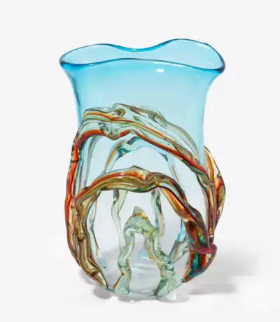 Murano, um 1970. Farbloses Glas, blau verlaufend. Wandung mit mehrfarbigen Aufschmelzungen. Im Stand signiert "Salviati Murano" (graviert). H 36,5 cm.