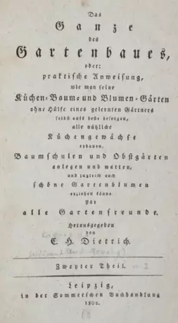 ╔Enthält:╗ Reichart,C. Land- und Garten-Schatzes. 5 Bde. Erfurt 1774. - Dietrich,C.H. Das Ganze des Gartenbaues... Bd. 2 (v.2). Lpz. 1813. - Willdenow,C.L. Grundriss der Kräuterkunde. 4. Aufl. Bln. 1805. - Lenz,H.O. Die nützlichen und schädlichen Schwämme... Gotha 1840. - Schmidt,O. u. F.Herzog (Hrsg.). Der populäre Gartenfreund. 2. Aufl. Quedlinburg 1843. - Dietrich,F.G. Der Wintergärtner... 2. Aufl. Weimar 1802. - Osten,H.v. Der Niederländische Garten... Wolfenbüttel 1712. - Lueder,F.H.H. Briefe über die Bestellung eines Küchengartens. 3. Aufl. Tl. 1. Hannover 1778. - Wendland,J.C. Handbuch der Gartenbau-Kunst. Hannover 1813. Alters- u. Gebrauchssp.
