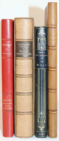 ╔Enthält:╗ L'Estoille,A.de. Les Mois. Illustr. de Le Rat. Paris, Lemerre 1896. Dunkelblauer Hmaroquin mit goldgepräg. Fileten, Rverg. u. Kopfgoldschn. - Warnod,A. 3 petites filles dans la rue. Illustr. v. Pascin. Paris, Fanfare de Montparnasse 1925. Roter Hmaroquin. (Bernasconi) mit Kopfgoldschn. u. eingeb. OU. - Le Nouvel Imagier... Societe de la Gravure sur Bois originale. Jg. 1914. Paris, Roger & Chernoviz (1914). Eines von 300 Ex. auf Velin (GA 321). Brauner Hldr. mit Kopfgoldschn. - Sterne,L. Voyage sentimental en France et en Italie. Illustr. de Sauvage. Paris, Creuzevault 1942. Eines von 500 Ex. auf Velin (GA 550). Grüner Hldr. mit Kopfgoldschn., in Pp.-Schuber.