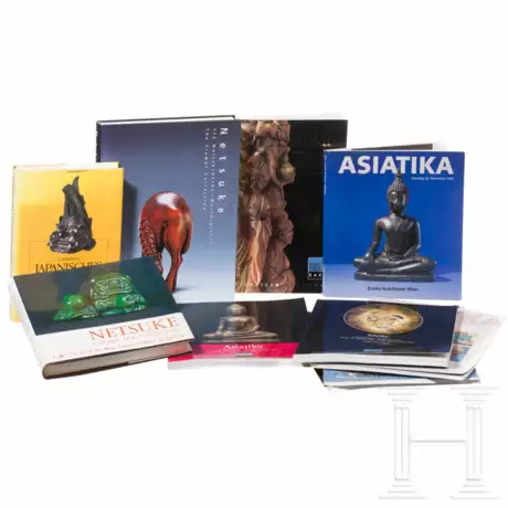 Sechs Auktionskataloge der Galerie Zacke in Wien aus den Jahren 1995 - 1998 im Softcover, die Ecken leicht berieben bzw. deformiert. Dazu gebundener Netsuke-Sammlungskatalog des Linden-Museums Stuttgart, mit vielen Bildern und sachkundiger Einführung in die Produktionsgeschichte von Netsuke. Dazu ein Sammler-Nachschlagewerk zu Netsuke mit strukturierten Differenzierungshilfen (mit Schutzumschlag) sowie ein ebenfalls für Sammler geschriebenes Nachschlagewerk über japanisches Kunsthandwerk (239 Abb. in S/W, mit Schutzumschlag).