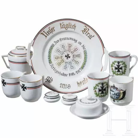 Bestehend aus fünf Tassen, drei Zuckerdosen, einer Butterdose und einem Teller. Alle Teile mit patriotischen Motiven, tlw. Herstellermarkierung im Boden. Alters- und Gebrauchsspuren.