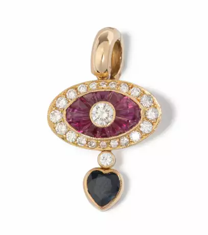 750 Gelbgold. Ovaler Anhänger mit Brillanten ca. 0.50 ct und einer Entourage aus Rubin-Baguetten von zus. 1 ct über einem Saphir in Herzform ca. 0.50 ct, L 3 cm, 5g.