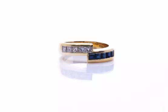 750 yellow gold, hallmarked, set with 5 square-cut diamonds, total approx. 0.4 ct, G, VVS-VSI, and 5 square-cut sapphires, total approx. 0.5 ct, ring size 54, total weight approx. 8 g