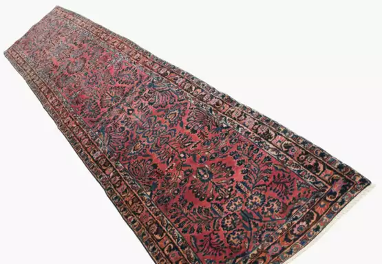 Z-Persien, um 1910. Sog. "Amerikanischer Saruk". Das gesamte rosarote Mittelfeld ist in unendlichem Rapport mit eleganten Blütenmedaillons, Bouquets, Blütenketten und Blattranken stilvoll überzogen und wird von einer nachtblauen Hauptbordüre gesäumt, die mit Palmetten und Blütenzwickeln auf dekorative Weise verziert ist. Gute Erhaltung. 78x438 cm (ft. 2.6x14.5).