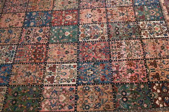 S-Persien, um 1960. Sog. "Garten-Muster". Filigrane Borten teilen das mehrfarbige Mittelfeld in einzelne Felder, die mit verschiedensten Bäumen- und Blüten-Motiven reichlich verziert sind. 2 schmückende helle Blütenborten säumen die Hauptbordüre, die mit persischen Gedichts-Kartuschen und Tiermedaillons alternierend kunstvoll besetzt ist. Gute Erhaltung. 280x358 cm (ft. 9.2x11.8).