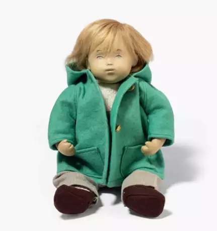 Schweiz, um 1969. Ganz aus Kunststoff. Kurbelkopf bemalt. Grünblaue Augen und hellrosa Lippen. Gelenke mit Unterlagen aus Filz. Rotblonde Echthaarperücke. Sasha-Bekleidung und Filzschuhe. Kapuzenmantel mit Label. Pullover und Socken (gestrickt) sowie Unterhose ergänzt. Auf der linken Fussohle bezeichnet "Sasha". H 32 cm.