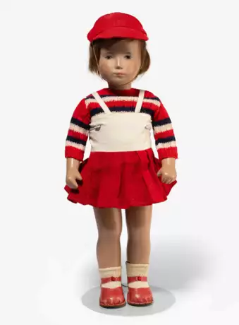 1954. Ganz aus Gips. Kurbelkopf bemalt. Graue Augen und hellrote Lippen. Gelenke mit Filz unterlegt. Rotbraune Echthaarperücke mit Kurzhaar-Frisur. Kleid und Schirmmütze mit Sasha-Label. Pullover und Unterhose (gestrickt) assortiert. Sasha-Socken und -Schuhe. Auf linker Fusssohle bezeichnet "4/54, Sasha". Rechte Fusssohle beschriftet "Weihnachten 1954". H 50 cm. Dazu: Keilhose.