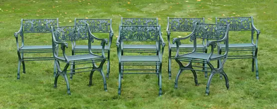 A set of eight cast iron garden armchairs according to a design by Karl Friedrich Schinkel.