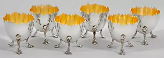 Sterlingsilber. Dekorativ in Form eines aufgebrochenen Eies gestalteter Korpus auf stilisierten Krallenfüßen. Innen vergoldet. Gest. 925. Gew. zus. ca. 275 g. H. 5,7 cm.