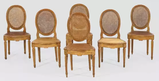 Buchenholz. Bombierte Profilzarge auf konischen, kannelierten Balusterbeinen. Hochovale, umlaufend profilierte Rückenlehnenrahmung. Sitz- und Lehnenfläche aus teilw. besch. Rohrgeflecht. Drei Stühle mit Schlagstempel-Sign. M. GOURDIN (wird Meister 1753). Sitz-H. 44 cm.