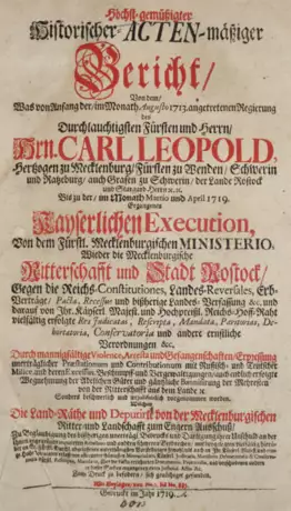 Heeß I, 4401. - Behandelt ausführlich den Streit zwischen der mecklenburgischen Ritterschaft und dem Fürstenhause hauptsächlich ausgelöst durch Steuersachen. Der 2. Teil mit 885 urkundlichen Beilagen. Gleichzeitig verläßliches Quellenwerk für die Geschichte Mecklenburgs in den Nordischen Kriegen. - Gering gebräunt, Titelbl. etw. eingerissen, St. auf Innendeckel.