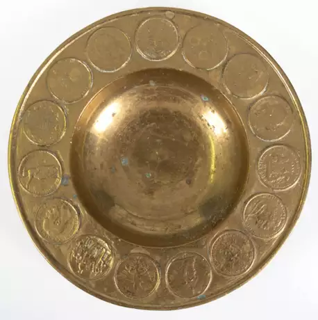 Schale, Messing vergoldet, im Rand 15 eingelassene Münzen, H. 3,5 cm, Dm. 21 cm