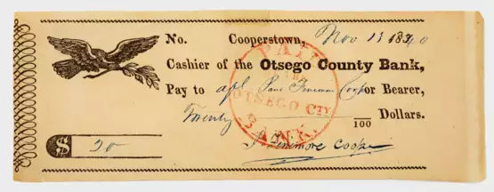Scheck der "Otsego County Bank" in Cooperstown über $ 20 mit Unterschrift des US-amerikanischen Schriftstellers James Fennimore Cooper (1789-1851), dat. 13.11.1840, Stempel-entwertet. Minim. Altersspuren. 5,6 cm x 15,7 cm.