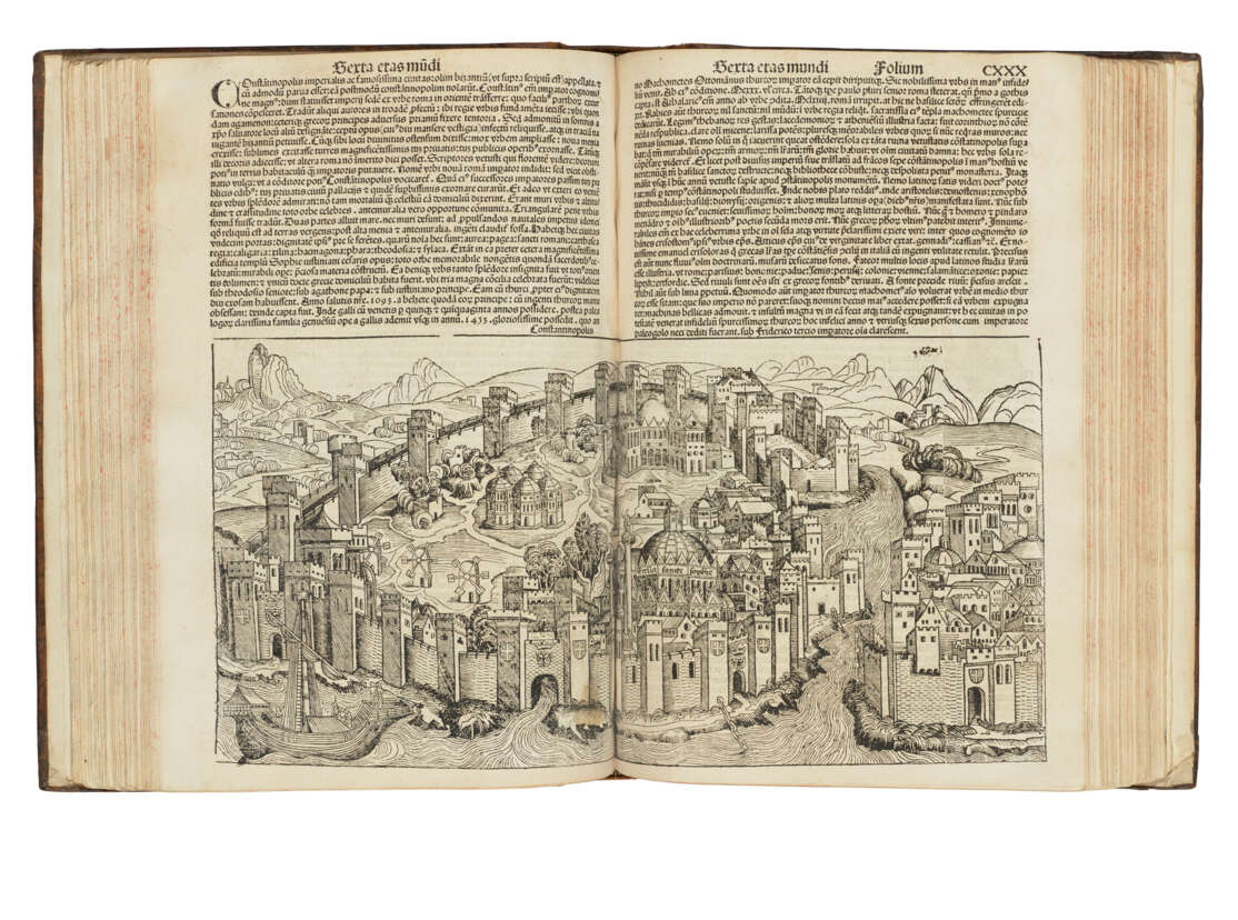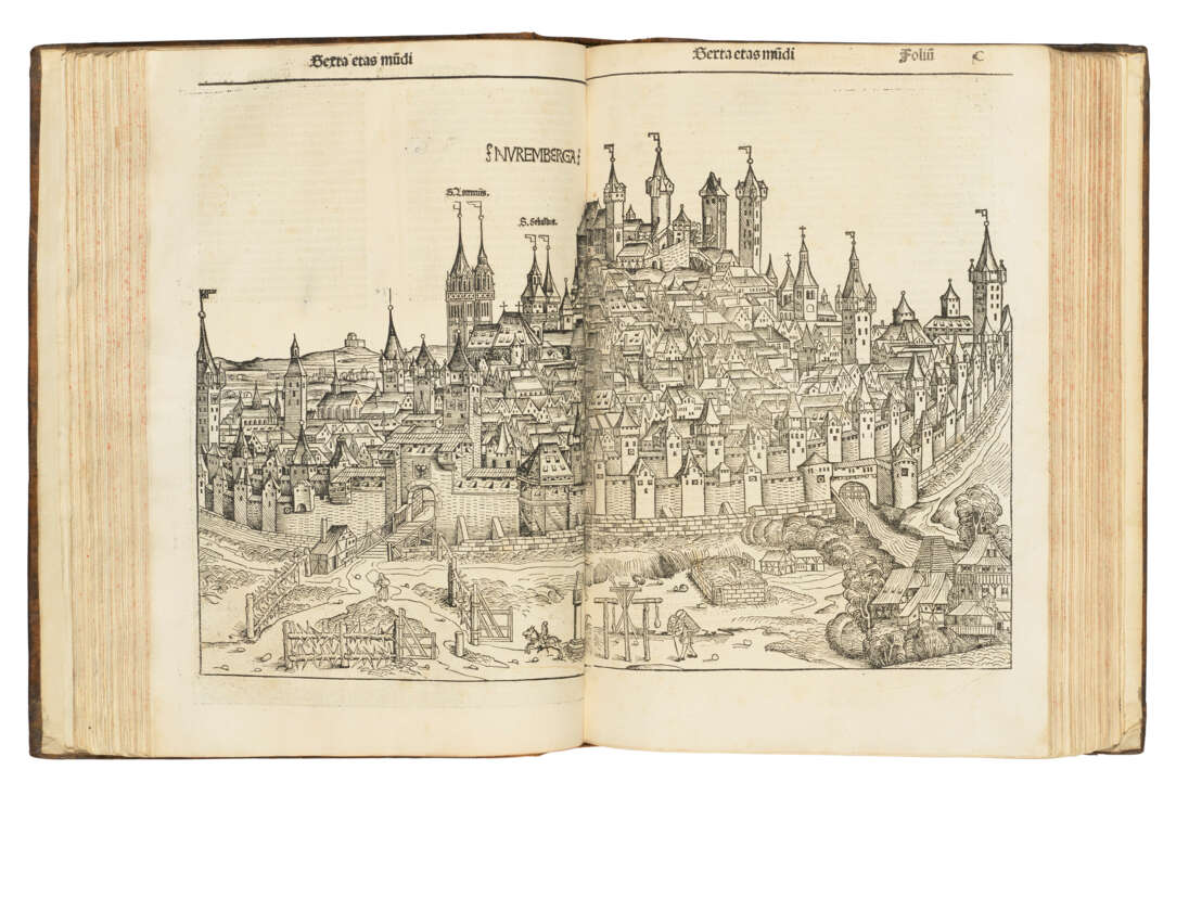 First edition of the Nuremberg Chronicle. The most extensively illustrated printed book of the 15th century, with over 1,800 woodcuts, including two double-page maps: a world map (Shirley 19) based on Mela's Cosmographia (1482), and a map of northern and central Europe by Hieronymus Münzer (1437-1508) after Nicolas Khyrpffs. The world map is one of only three 15th-century maps showing Portuguese knowledge of the Gulf of Guinea of about 1470. The map of Europe is closely associated with Nicolas of Cusa's Eichstätt map, with which it is thought to share a common manuscript source of c. 1439-54. It is therefore claimed to be the first modern map of this region to appear in print. Although published later than the map of Germany in the 1482 Ulm Ptolemy, it was constructed earlier (Campbell, The Earliest Printed Maps, 1472-1500, 1987). An elaborate manuscript exemplar, created to integrate text and illustration, survives, as do the contracts between Koberger and the artists responsible for the illustrations. Albrecht Dürer, godson of Koberger, was an apprentice to Wolgemut from 1486 to 1489 and was almost certainly involved in the production of the woodcuts. Two editions, one in Latin for an international audience and one in German for domestic readers, were planned simultaneously, each with its own specially designed, new type, and both with the same woodcuts; the Latin edition preceded the German by about 5 months. HC *14508; BMC II, 437; CIBN S-161; BSB-Ink. S-195; Bod-inc. S-108; Schreiber 5203; Goff S-307; ISTC is00307000.