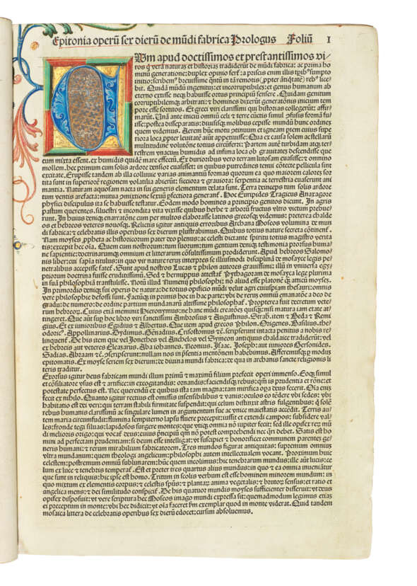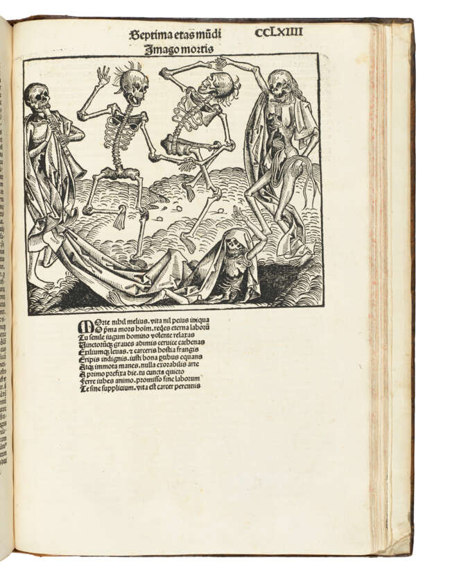 Imperial folio (410 x 285mm). 326 leaves (of 328, without the final 2 blanks), xylographic title, 1809 woodcut illustrations printed from 645 blocks (Sydney Cockerell’s count) including double-page map of the world and double-page map of Europe, 29 town views extending across two pages, and 8 full-page cuts, by Michael Wolgemut, Wilhelm Pleydenwurff and their workshop, including Albrecht Dürer, two principal initials supplied in colours on a burnished gold ground with extensions into the margins to form a part border (both cropped by the binder at the head), other major initials supplied in red, early pale wash colour added to some woodcuts in the first few quires (xylographic title with neatly repaired clean vertical tear at foot [not affecting text] and lower corner and edge strengthened with paper strips, minor worming repaired at foot of gutter in first few quires, fol. 129 with small repaired tear with tape on image, fols. 175 and 176 restored at head [possibly supplied from another copy] with a little text neatly supplied, fol. 232 with minor wear to a few words, occasional manuscript annotations or marginalia in pen or pencil, a few shaved by the binder). 18th-century speckled calf (rebacked, extremities rubbed, corners bumped). Provenance: small ink signature or inscription on title erased and covered by small paper slip.