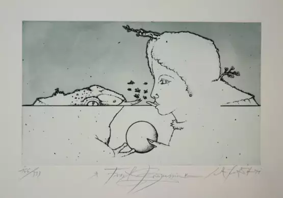 Je eines v. 333 num. Ex. - Enthält die je v. Schindehütte num., sign. u. kalligr. betitelten separaten Graphiken: Dornröschen für die Marie (Farbrad.), Frosch-Prinzessin (dplblgr. Rad.), Herr Fix & Fertig (Rad.) und einen dreiteiligen Holzschn. ohne Titel. - Tls. schwache Gebrauchssp.
