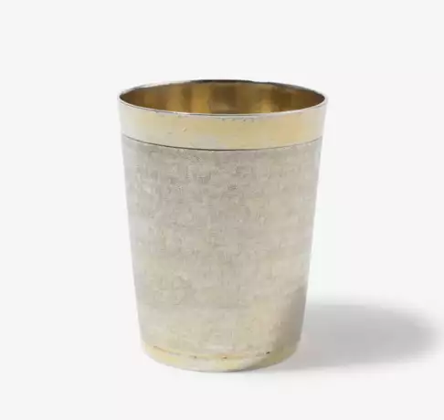 Silber, teilvergoldet. Meistermarke Johann Jakob Petrus. (Seling Nr. 1684). Zylinderform, Wandung gepunzt zwischen glattem Fuss- und Lippenband. Bodenunterseite: Augsburger Beschau-, Meistermarke, unleserliche Resten einer Gravur u. Termolierstrich. H 10 cm, ca. 172 g.