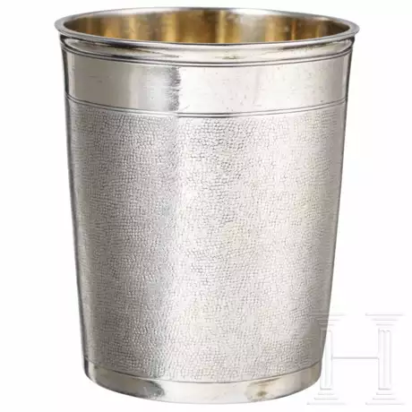 Silber, innen vergoldet. Konischer Becher mit profiliertem Lippenrand auf flachem Boden. Die Wandung umseitig mit feiner Schlangenhautpunzierung. Unterseite mit Tremolierstrich, Beschauzeichen und Meistermarke "MH". Maße 8,7 x 7,5 cm, Gewicht 142,54 g. Vgl. Seling, Nr. 86, 1526.