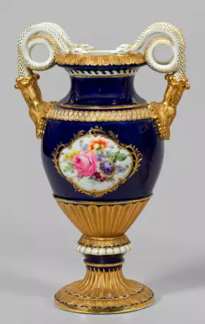 Auf rundem Fuß amphorenförmiger Korpus, umzogen von reliefierten Ornamentbordüren. Seitlich aus plastischem Akanthusblattansatz aufsteigende Henkel in Gestalt von spiralförmig eingerollten Schlangenpaaren. Auf der Wandung kobaltblauer Fond, schauseitig ausgesparte, rankenumzogene Vierpassreserve mit Blumenbukett in polychromer Malerei. Goldstaffage. Entw. Ernst August Leuteritz. Modell-Nr. E 116. Schwertermarke. H. 39,5 cm.