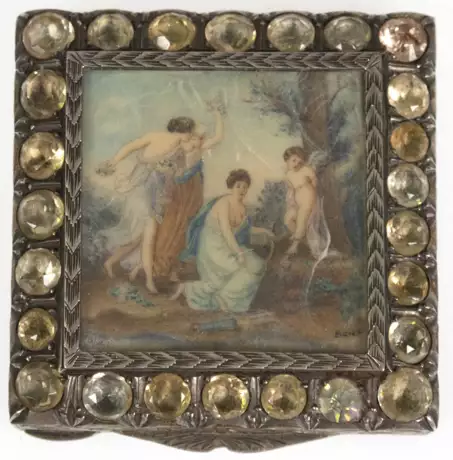 Schminkdose, Ende 19. Jh., 800er Silber, innen vergoldet, auf Deckel amouröse Miniaturmalerei hinter Glas, umrandet von 25 Farbschmucksteinen, Boden mit Akanthusblatt- und Floraldekor, 1,8x7,2x7,2 cm