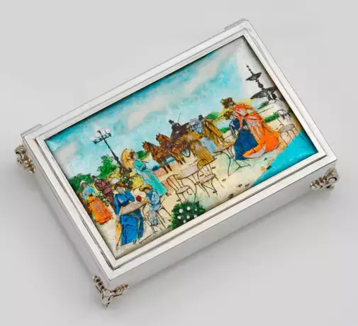 Silber, teilw. emailliert. Rechteckiger Korpus auf vier Volutenfüßen, scharnierter Deckel mit großer rechteckiger Mittelkartusche. Darin Emailmalerei mit flanierenden Damen, Kutsche, Cafétischen und Springbrunnen. Innen vergoldet. Gest. 925. Gew. ca. 430 g. H. 5 cm. 15,5 cm x 10,5 cm.