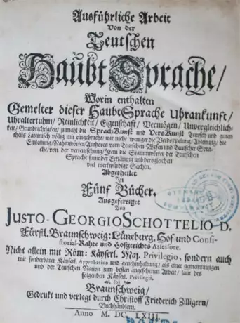 Faber du Faur 697. Jantz 2265. Wolfskehl 378. Seebaß, N. F., 832. Dünnhaupt 37.1. Erste Ausgabe.- "Das wichtigste Sprachwerk vor Jakob Grimm." (Wolfskehl). - Titel mehrf. gestempelt, gebräunt und stellenw. fleckig, Innengelenke gebrochen, Vorsatz mit Besitzvermerken, Ebd. berieben, Rücken mit Wurmspuren. - Aus namhaftem Vorbesitz: Exlibris von Wilhelm Hertz, dem Altgermanisten und mit Heyse befreundeten Dichter.