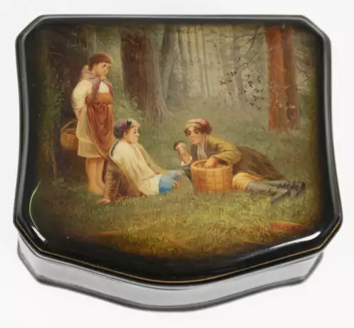 Lot 597 | Schwarzlackdose, Rußland, Deckel mit Miniaturmalerei "Drei Kinder im Wald beim Pilze sammeln", gebauchte Front, 3,8x7,3x6,4 cm