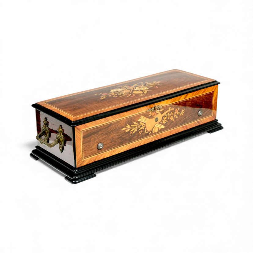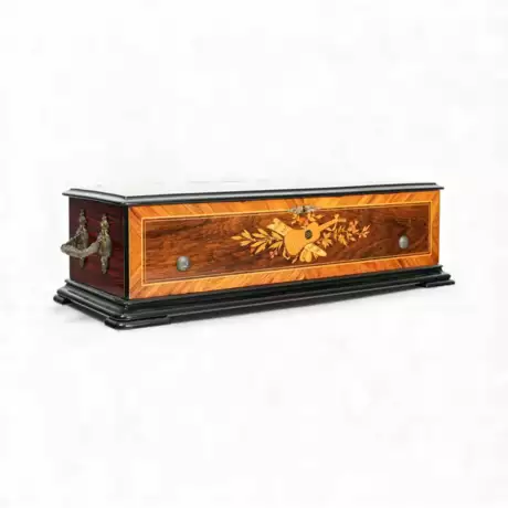 Switzerland, Geneva, Baptiste Antoine Brémond (Geneva 1834-1925) and son Philippe Albert Brémond (1863-1930), circa 1910. Mechanical musical instrument (idiophone) with rotating shaft, metal tongues that determine the melody together with the metal comb. Wooden box with inlaid musical instrument motifs, side carrying handles, approx. height 22 cm, length 83 cm, depth 28 cm, in working order.