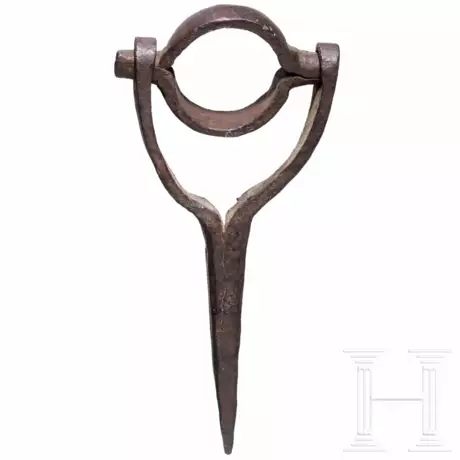Schmiedeeisen. Runde Aufnahme für den Büchsenlauf in eiserner Gabel mit vierkantigem Dorn. Durchmesser der Öse ca. 5 cm, Gesamtlänge ca. 23 cm.