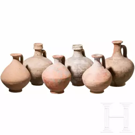 Sechs Kannen aus ziegelfarbenem oder hellbeigem Ton mit Standring, doppelkonischem Korpus mit weichem (viermal) oder kantigem (zweimal) Umbruch, schmalem, eingezogenem Hals und bandförmigem Henkel, der unterhalb der Randlippe im Bogen zur Mitte der Schulter geführt wird. Die Randlippen bei vier Exemplaren horizontal ausgestellt, zwei Exemplare mit hohen und dicken, profilierten Rändern, die deutlich vom Hals abgesetzt und nach außen gestellt sind. Oberflächen teils mit Überzug aus geschlämmtem Ton versehen, teils mit Inkrustationen und Sinter bedeckt. Oberflächen meist leicht berieben, zwei mit kleinen Ausbrüchen, sonst intakt. Höhe 12,5- 16 cm.