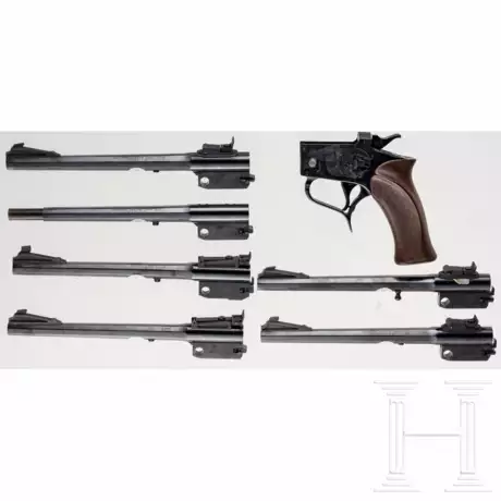 Cal. .45Auto, SN. 60282, blanker oktagonaler Lauf im Kal. .45 Auto mit Visierung. Länge 25,5 cm. Blanker Oktagonallauf mit offener Visierung. Länge 25,5 cm. Oktagonaler Wechsellauf im Kal. .38 Spec.. Länge 25,5 cm. Oktagonallauf im Kal. .22lr. mit auf vier Zentimeter abgedrehter Fläche an der Mündung. Lauf ohne Visiereinrichtung. Oktagonallauf im Kal. .25-35 Win. Länge 25,5 cm. Oktagonallauf im Kal. 9mmLuger. Länge 25,5 cm. Dazu ein vollständiges Griffstück mit glattem , dunklem Nussholzgriff.