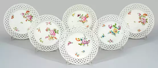 6-tlg.; 4 Teller Wien, 2 Teller Meissen. Runde, leicht vertiefte Form mit gewelltem Rand. Im Spiegel Blumengebinde und Einzelblüten. Korbreliefdekor im Spiegel und flechtartig durchbrochen gearbeitete Fahne. Polychrome Malerei. Unw. rest.; Partiell ber.; Manufaktur- und Schwertermarke. D. 23,5 cm - 24,5 cm.