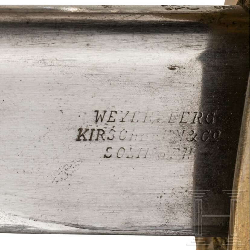 Kräftige Steckrückenklinge mit Schör, an der Wurzel gemarkt "Weyersberg Kirschbaum & Co. Solingen" und "Erfurt" unter Krone, am Rücken der militärfiskalische Stempel "W / 05" unter Krone sowie gotische Abnahme. Schweres Buntmetallgefäß (gotische Abnahme), am Stichblatt der reliefierte Adler "WR II" und innenseitig der Stempel "L.G.". Fischhauthilze mit Drahtwicklung, lederne Fingerschlaufe intakt. Schwarze Lederscheide (etwas berieben) mit Messingbeschlägen (gotische Abnahme), am Mundblech der Truppenstempel "L.G.", brauner Leder-Koppelschuh (später ergänzt). Insgesamt schön erhalten, Spitze etwas narbig, Gebrauchs- und Altersspuren. Länge 77 cm. Entspricht dem Seitengewehr für Fahnenträger. Sehr selten.