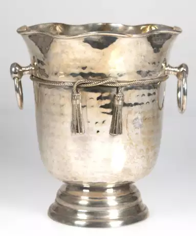 Lot 709 | Sektkühler, versilbert, runder getreppter Stand, Korpus mit Hammerschlagdekor, gewelltem Rand und seitl. Ringhenkeln, H. 25 cm, Dm. 20 cm