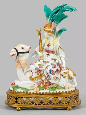 Montiert auf einem floral durchbrochen gearbeitetem Podest im Louis XVI-Stil aus vergoldeter Bronze. Naturalistisch gestalteter, mit plastischen Blüten und Blättern belegter Sockel. Auf einem Dromedar vor einer Palme sitzende, zur Seite blickende Asiatin, gehüllt in einen Mantel über langem, von Indianischen Blumen gemustertem Gewand. Ihr Haar bedeckt von einer orientalischen, mit Federn geschmückten Haube. In der linken Hand ein Rauchgefäß, in der rechten ein goldenes Zepter haltend. Das naturalistisch staffierte Dromedar mit schwarzem Riemenzeug ist bedeckt mit einer mit Edelsteinen und Quasten verzierten Schabracke. Polychrome Malerei mit Goldstaffage. Entw. Johann Joachim Kaendler, 1746. Rest.; Blasse Schwertermarke. H. 22 cm.