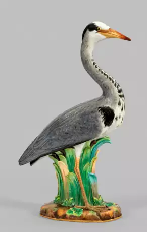 Auf einem mit Seerosenblättern reliefiertem Natursockel, zwischen emporragendem Schilf, stehender Fischreiher (bzw. Graureiher) mit langen Stelzenbeinen. Leicht reliefiertes Gefieder und naturalistische Staffierung des Federkleides sowie der Augen- und Kopfpartie. Polychrome Malerei mit Goldstaffage. Entw. Ernst August Leuteritz, um 1850. Modell-Nr. Z 57. Minim. rest.; Schwertermarke. H. 57 cm.