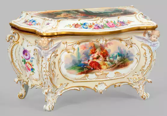 in Form einer Rokoko-Kommode. Dreiseitig geschweifter, bombierter Korpus auf Volutenfüßen mit stark ausgezogenen Ecklisenen, frontseitig bekrönt von plastischen Puttenköpfen. Gering überstehender, dem Korpus entsprechend profilgerahmter Scharnierdeckel. Reicher reliefplastischer Rocaille- und Muscheldekor. Auf der Wandung von Blattranken gerahmte Reserven mit pastell-gelbem Teilfond, unterhalb begrenzt von geschweiften Schuppenzwickeln. Auf dem schräg ansteigendem Deckel großflächige, von Blumengebinden gesäumte Darstellung "Les Charmes de la vie champêtre" ("Die Freuden des Landlebens" nach einem Ölgemälde von François Boucher. (Musée du Louvre, Paris). Schauseitig korrespondierende Darstellung Bouchers nach dem Gemälde "Zwei Schäferinnen". Die Schmalseiten mit Blumengebinden. Die gerade Rückwand mit grauem Stoff belegt sowie goldfarbenem, gravierten Scharnier. Feine polychrome Malerei außerhalb der Manufaktur. Reiche Goldstaffage. Form-Entw. Robert Schirmer, um 1885. Modell-Nr. 3117. Innen mit hell purprfarbener Samtverkleidung. Unw. rest.; Zeptermarke. H. 31,5 cm. L. 52 cm. B. 25 cm.