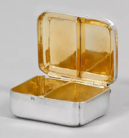 Silber. Rechteckiger Korpus mit scharniertem Deckel, leicht gebauchter Wandung und abgeschrägten Deckelkanten. Gravur am Rand "G. F. G. 1770". Innen vergoldet. Gest., Beschauzeichen, Meister Jürgen (Johann) Diederich Pape (wird Meister 1762). Gew. ca. 115 g. H. 3 cm. 5,5 cm x 8 cm.