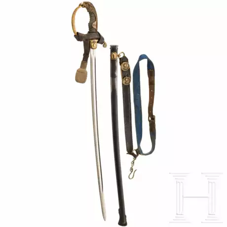 Vernickelte, leicht geschwungene Rückenklinge, gemarkt "Robert Klaas Solingen". Reich reliefiertes, vergoldetes Buntmetallbügelgefäß (berieben) mit Adlerkopfgriffkappe, Fischhauthilze (berieben) und dreifacher Drahtwicklung, am terzseitigen Parierlappen aufgelegt das Symbol der platzenden Granate. Anhängend ein Portepee mit Lederband und blau-rot-gelber Quastenfüllung. Brünierte Eisenscheide (etwas berieben) mit Buckelringband und einem beweglichen Tragering aus Buntmetall, daran das Unterschnallgehänge, an den Beschlägen ebenfalls die platzende Granate. Partiell leicht beschädigt, Altersspuren. Länge 82,5 cm.