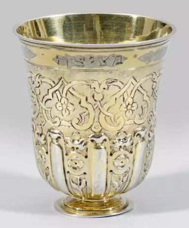 Silber, vergoldet. Hochgezogener Stand, sich konisch erweiternder Korpus mit profiliertem Lippenrand. Wandung mit Blütenmotiven umlaufend godroniert, darüber ziseliertes Bandelwerk. Gest. Stadtmarke, Meister Georg Philipp Steu(e)rnagel (um 1675 - 1727, Meister 1706). Gew. ca.104 g. H. 8,5 cm.