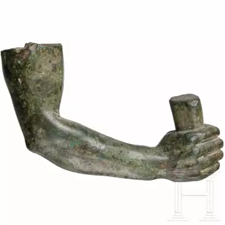 Bizeps und Unterarm, in den Händen eine Schriftrolle haltend, zum Einsetzen in eine Figur, möglicherweise aus anderem Material. Die anatomischen Details des muskulösen Arms präzise und wohlproportioniert ausgeführt, ebenso die Finger der Hände. Sehr schöne, dunkelgrüne, leicht glänzende Patina mit rötlichen Einsprengseln. Im Oberarm mittig auf der „Schnittfläche" Reste eines Dorns zur Befestigung. Länge 9 cm.