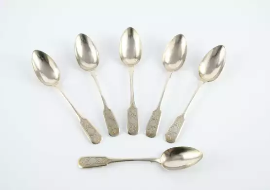 Lot 883  | SERIES OF SIX SILVER SOUP SPOONS WITH ORNAMENTAL DECOR