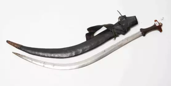 Äthiopien, 19. Jh. Sanduhrförmiges Horngefäss mit Knaufbalken und Nietknäufchen aus Messing. Stark sichelförmig gekrümmte, beidseitig geschärfte Gratklinge (L 69 cm) mit Mittelspitze. Scheide aus randlich punziertem , dunkelbraunem Leder mit Ortband aus Leder und Tragriemen. L 81 cm.