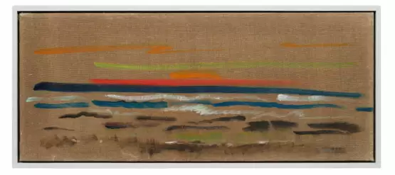 Zeichenhafte, auf horizontalen Farbspuren beruhende Komposition, die die Bewegung der Wellen und den Verlauf der sich am Horizont spiegelnden Sonnenstrahlen gestisch einfängt. Sigward Sprotte studierte u. a. bei Emil Orlik, Kurt Wehlte und Maximilian Klewer und ließ sich 1945 auf Sylt nieder, wo ihn die nordfriesische Landschaft zu seinen charakteristischen Strand- und Wellenmotiven inspirierte. Öl/Lwd.; R. u. sign.; Verso betitelt sowie dat. 1966. 33 cm x 79,5 cm. Rahmen.