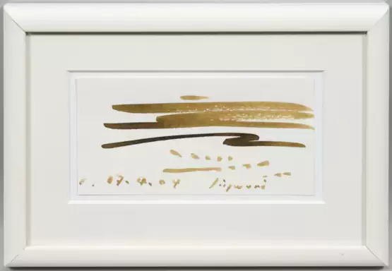 Aus gestischen Strichen, Schwüngen und Flecken zusammengesetztes, stark reduziertes Blatt in Beige-Braun. Charakteristische, späte Arbeit Sprottes, der ab 1945 auf Sylt ansässig war, wo ihn die nordfriesische Landschaft in seiner Motivik inspirierte. Aquarell/Papier. Unterhalb sign. und dat. 17.4.(20)04. 10,5 cm x 21 cm. Rahmen.