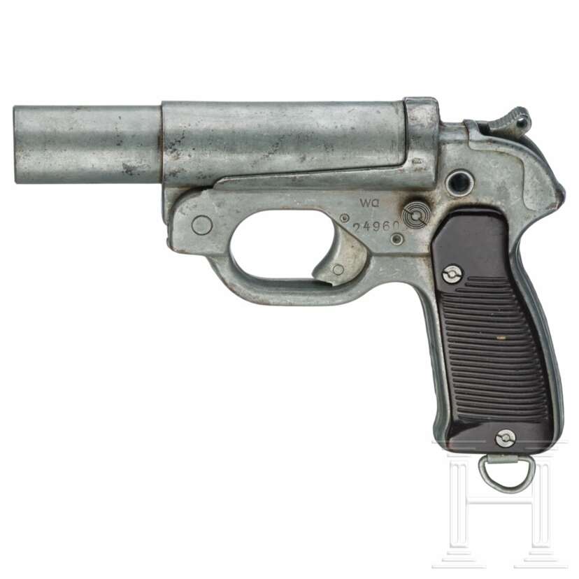 Kal. 4 (Signal), Nr. 249601, partiell leicht rauer Lauf, Länge 155 mm. Signalstift. Links am Rahmen über der S/N Code "wa" für Waffenfabrik Hugo Schneider AG, Leipzig (HASAG). Abnahme Adler mit "WaA10". Fertigung in Blechprägetechnik, galvanisch verzinkt, fleckig. Dunkelbraune Bakelitgriffschalen. Fangring.