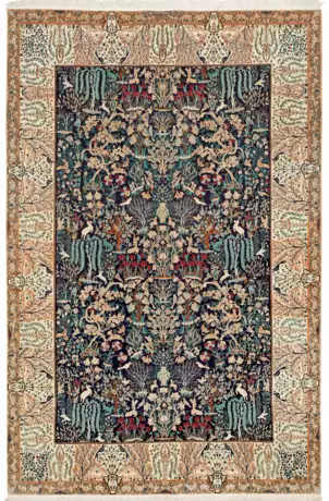 Persien. Korkwolle mit Seidenhighlights auf Baumwolle. Im dunkelgrundigen Innenfeld flächendeckende Paradiesgartenmusterung aus dicht angeordneten Blütenrispen, -dolden, unterschiedlichen Wildtieren und Vögeln. Umlaufend breite, elfenbeinfarbene Bordüre aus unterschiedlichen Zweigen und Vasenmotiven. Sign.; 190 cm x 285 cm.