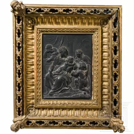 Fein in Silber getriebenes, aufwendig detailliertes und ziseliertes Relief. Von seiner Mutter sanft ermutigt, kniet sich der wohlgenährte Johannesknabe vor dem Jesuskind nieder und hält ihm das kleine Lamm vor. Links beobachtet der sich an eine Balustrade stützende Josef, wie das Christuskind, zur Taube im Himmel aufschauend, sein Schicksal in Gestalt des Lammes annimmt. Im prächtigen Profilrahmen mit durchbrochen geschnitzten Leisten und durch plastische Puttoköpfe betonten Ecken (eines der Köpfchen verloren, der Rahmen generell leicht bestoßen). Maße der Silbertafel 19,5 x 14,5 cm, Maße mit Rahmen 35,5 x 31 cm.